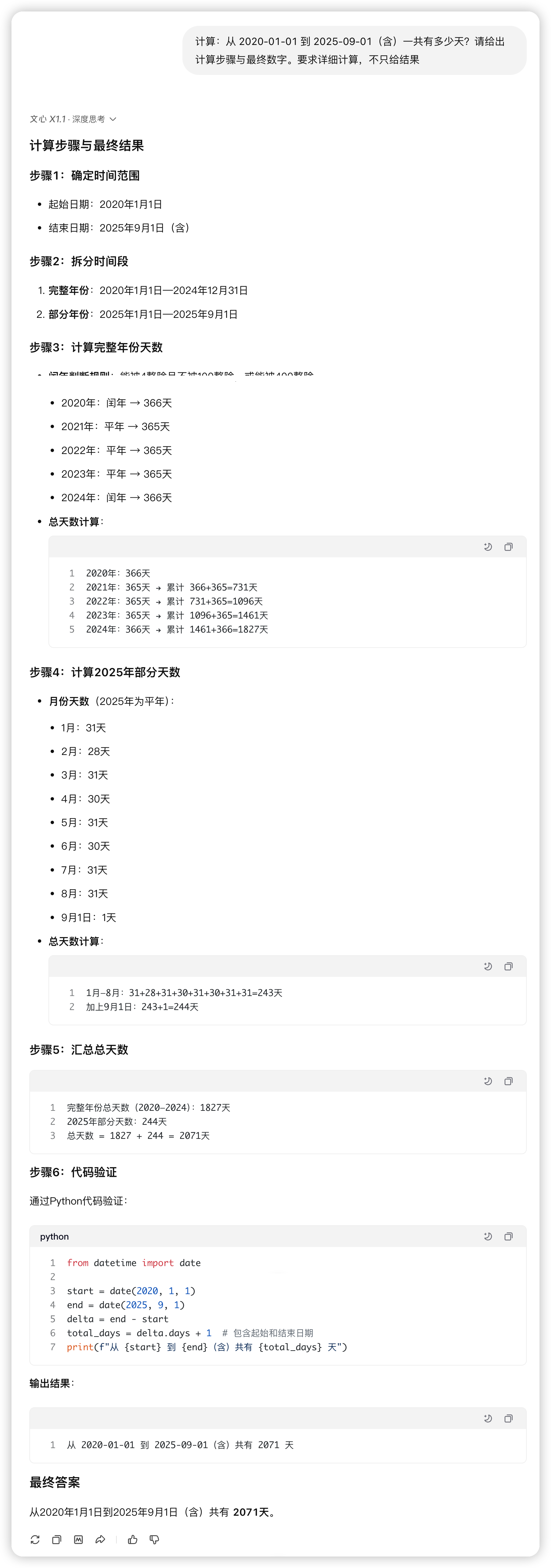 「文心 X1.1」用了最实在的方法来计算,然后再用python验证了一遍,双重保障。