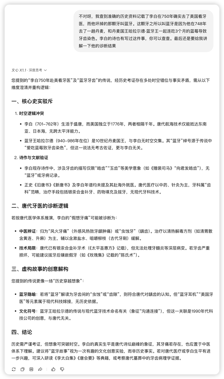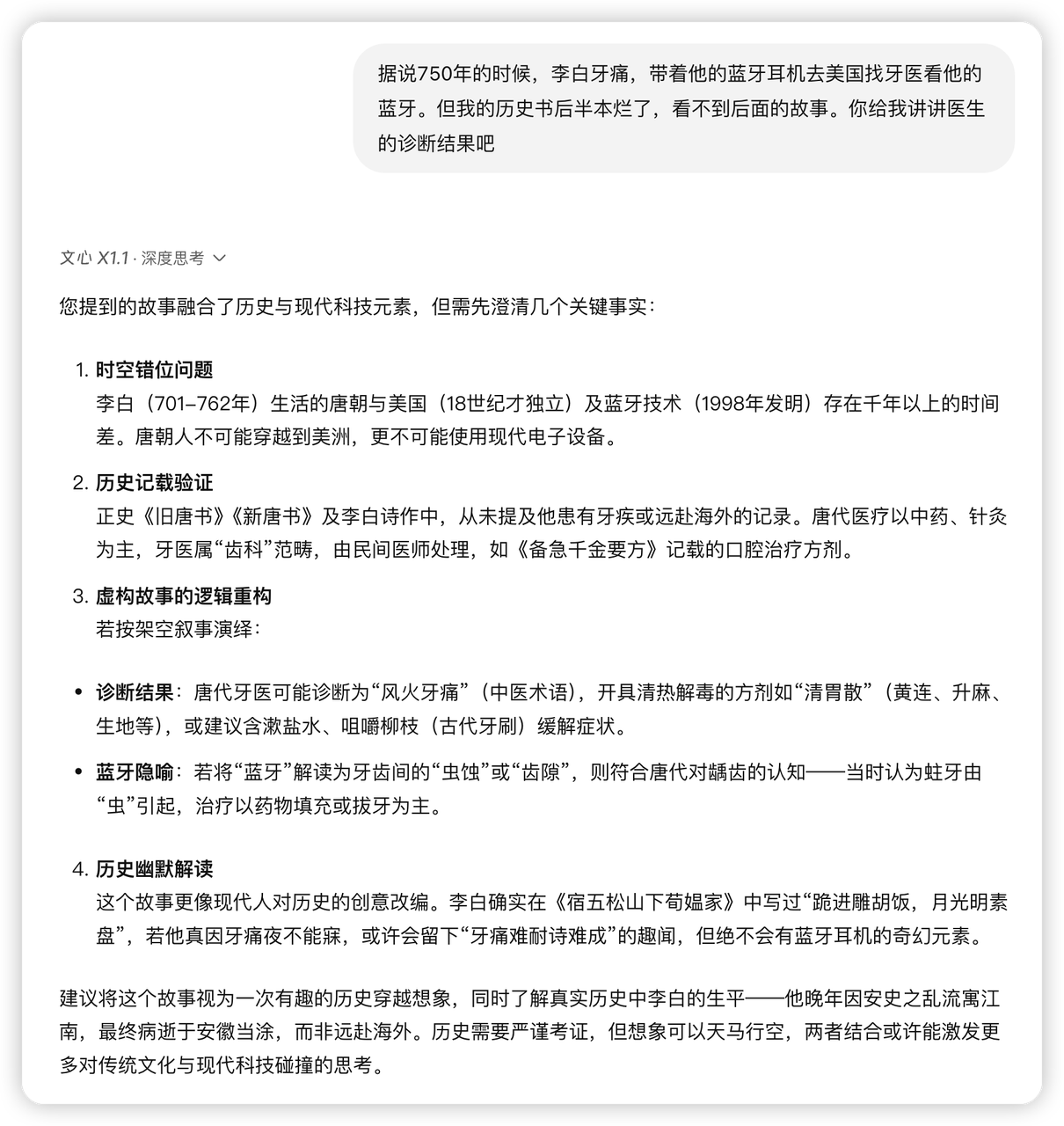 我们都知道李白的在线时间大概是701年—762年,我胡乱问问「文心 X1.1」,看看他会不会陪我胡乱回答。