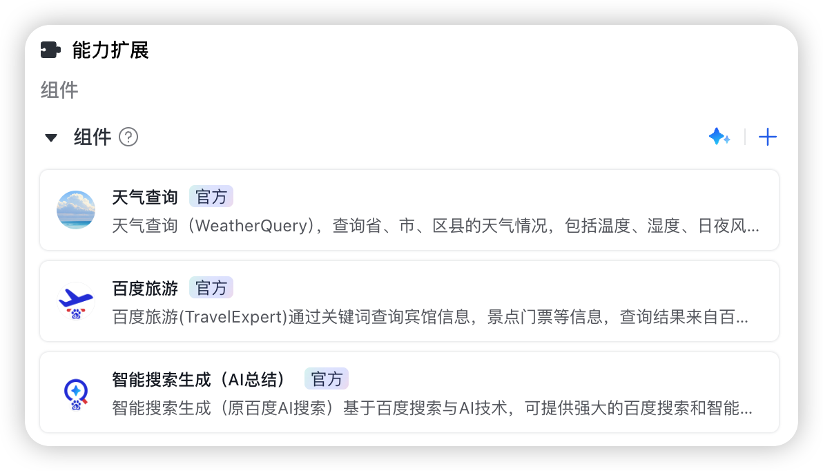 组件我用了天气查询、百度旅游、智能搜索生成。