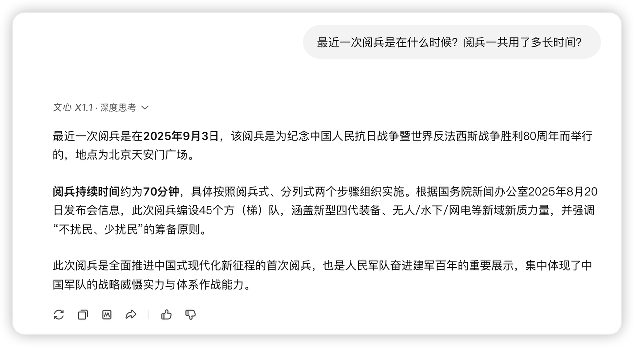 本文是在2025年9月9日写的,看看「文心 X1.1」能不能搜索到最新的新闻。