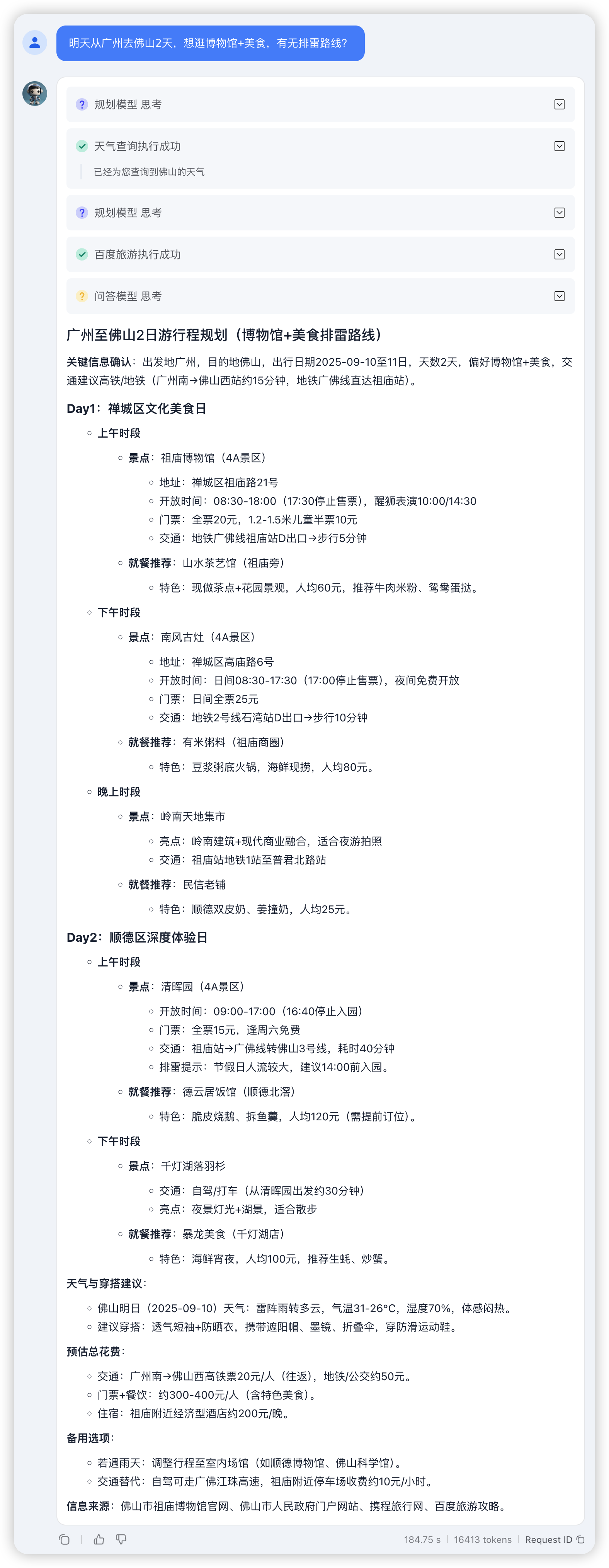 从测试结果可以看出,它很智能的调用天气组件查询了出行期间的天气状况,给出对应的穿搭建议;调用了旅行组件查询当地景点相关信息,避免返回一些过时信息误导用户。