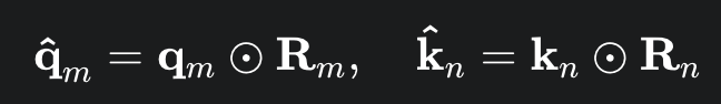 其中,⊙ 代表逐元素相乘,Rm 是一个旋转矩阵,其元素由三角函数定义。这种设计确保了两个位置为 m 和 n 的词,其内积只依赖于它们之间的相对距离 (m−n)。