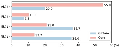 图4示出了人工研究结果。使用我们的框架训练的CodeLlama在错误定位方面比gpt - 4o表现更好,AL和PL的示例分别增加了35.0%和3.0%,而EL和NL的示例分别减少了15.7%和22.3%。结果表明,即使是gpt - 4o也不能有效地识别出错误代码的错误位置,验证了该任务的挑战性。我们的Bug Locator使小型LLM(即CodeLlama)能够获得比gpt - 4o优越得多的性能,通过Code Diff样本验证了我们self-debug learning的有效性。