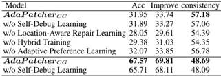 这项研究的目的是修复代码,同时需要最小的修改。为了完成这项新颖的任务,提出了一种方法AdaPatcher,它利用Self-Debug Learning(自调试学习)来训练Bug Locator,从而准确地识别Bug并通过Bug位置修复代码。对于Program Modifier,通过Location-Aware Repair Learning(位置感知修复学习)来训练program Modifier。然后提出了Hybrid Training for Selective Reference(选择性参考混合训练),有效避免盲目修改不正确的bug位置。此外,使用Adaptive Preference Learning(适应性偏好学习)来学习较少的修改。实验结果表明,AdaPatcher对于这项任务是有效的。