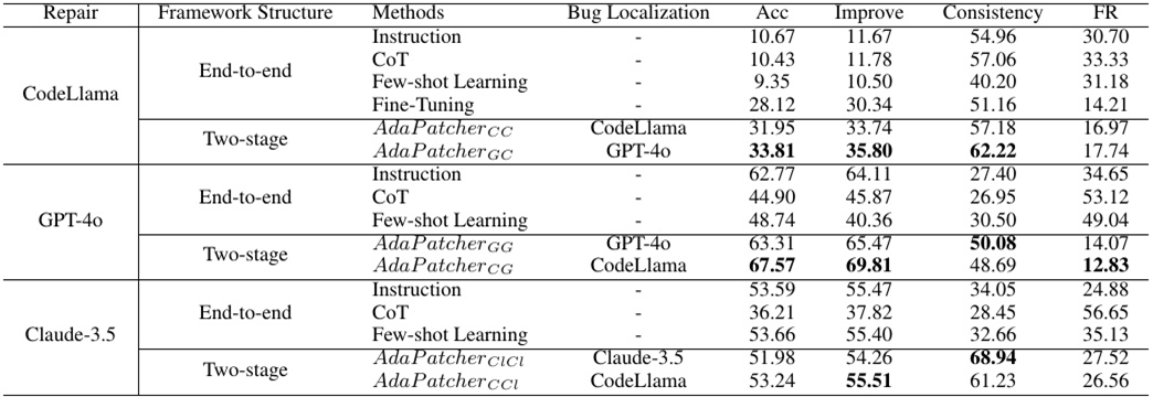 (3)此外,AdaPatcher在第二阶段(即程序修复)使用gpt - 4o时获得了更好的程序修复精度,在同一阶段使用CodeLlama时获得了更好的程序修复一致性。这可能是因为gpt - 4o在精度方面优于CodeLlama,因为它的模型参数要大得多。同时,CodeLlama在微调后识别bug位置方面也有自己的优势。因此,当我们选择CodeLlama作为第一阶段,gpt - 4o作为第二阶段时,可以获得最优的性能。