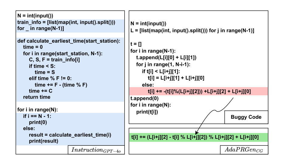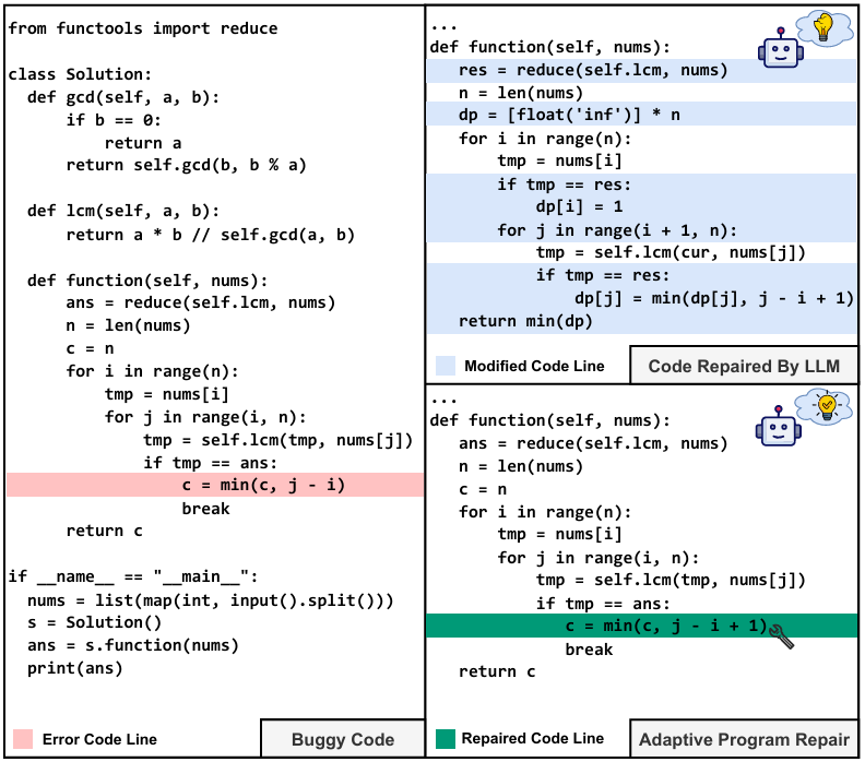 Figure 1: Example of AdaPR. The adaptive repaired code is correct and minimizes code modifications.