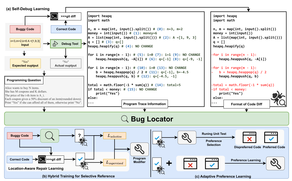 Figure 2: Overview of AdaPatcher. (a) Illustration of the Self-Debug Learning process. (b) Illustration of the Hybrid Train-ing for Selective Reference process. (c) Illustration of the Adaptive Preference Learning process.