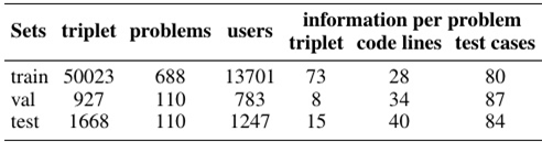 数据集。我们为我们的AdaPR任务构建了第一个数据集,命名为ACPR(准确性-一致性程序修复),旨在从准确性(即正确修复错误)和一致性(即最小化修改)两方面评估生成的补丁。具体来说,我们的数据集收集自CodeNet,其中包含来自不同用户的编程问题提交。对于给定的有bug的程序,我们将其与随机选择的失败测试用例(测试用例包括测试输入和预期输出)以及来自同一用户针对相同编程问题提交的通过的程序配对,从而生成⟨有bug的代码,失败的测试用例,通过的代码⟩三重组样本。整个数据集包含52,168个三元组数据样本。然后,我们将数据集按8:1:1的比例分成训练/验证/测试集,确保任何特定的编程问题只出现在其中一个集中,以避免数据泄漏问题。为了防止来自同一编程问题的代码数据过拟合,并确保评估的公平性,我们通过将训练/验证/测试集中每个问题的最大配对数限制在150/10/20来平衡数据集。数据集的总体统计信息如表1所示。