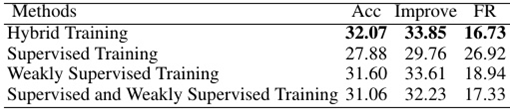Hybrid Training分析。为了验证选择性参考混合训练的有效性,在本节中,我们与其他常用训练方法进行了对比分析。我们进一步设计了我们的实验,将训练过程中的弱监督数据和监督数据结合起来。如表4所示,实验结果表明:
