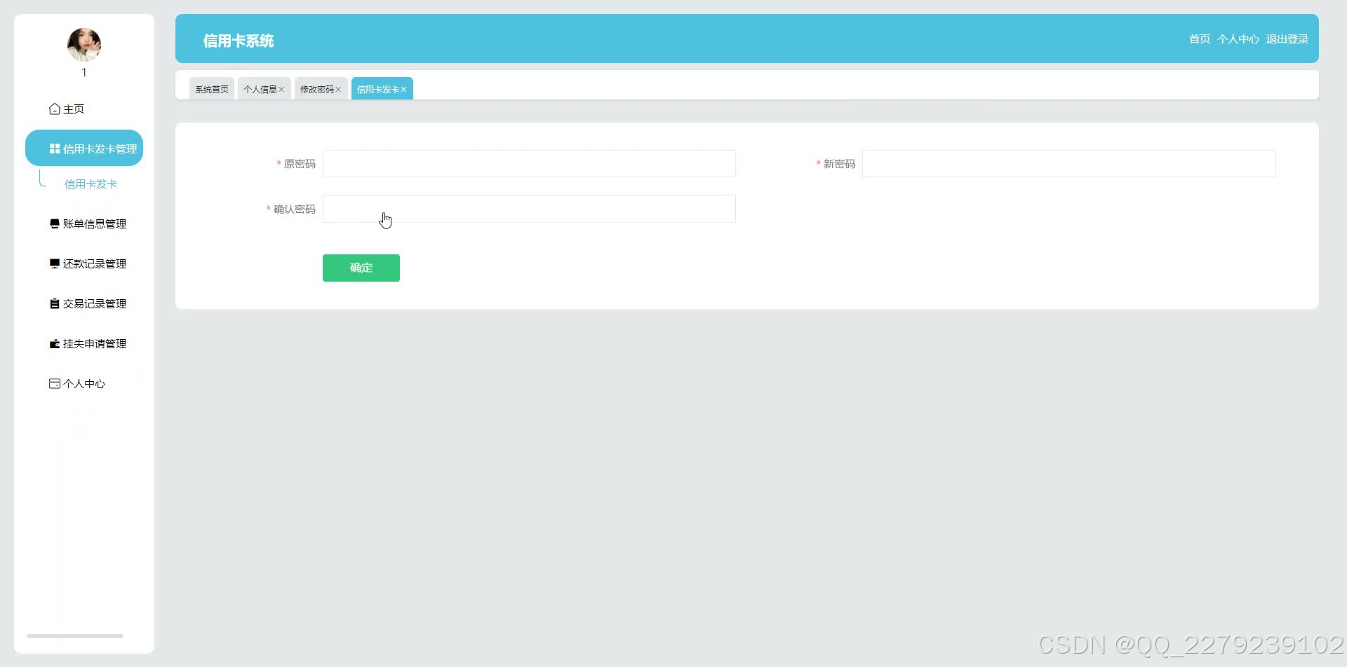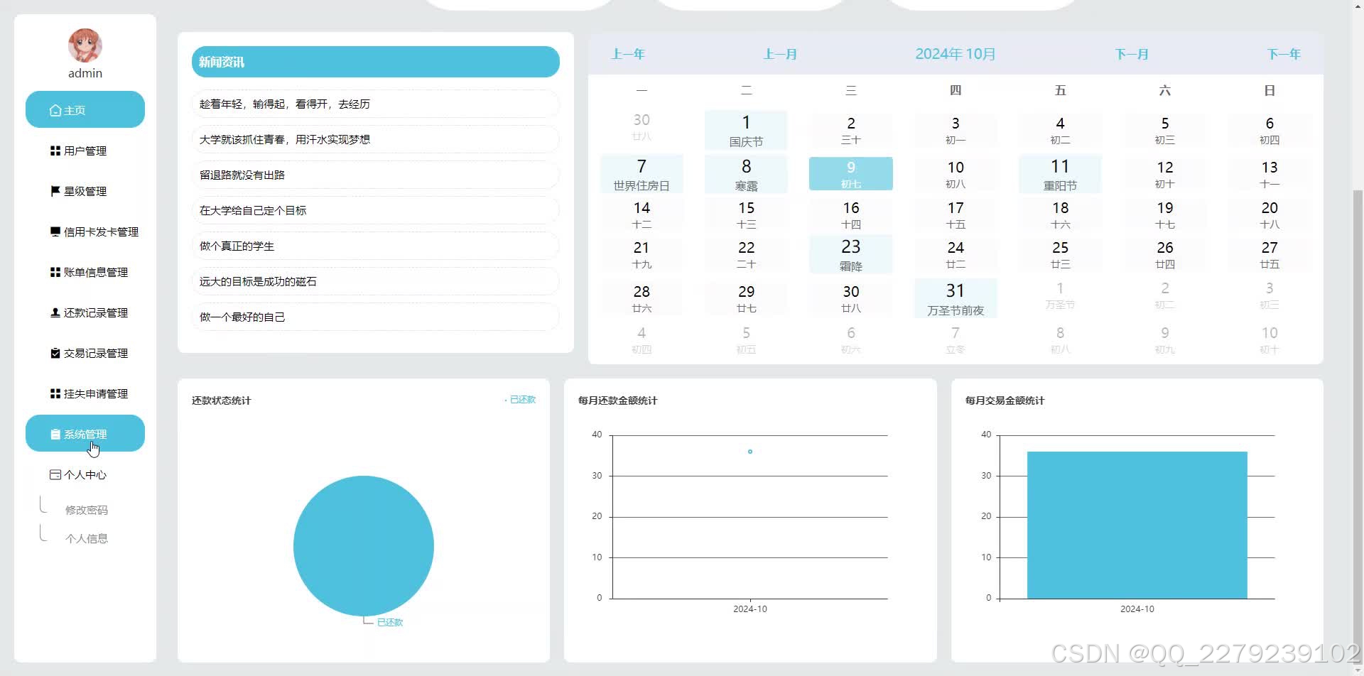 系统采用 SpringBoot 框架构建后端服务,集成 Spring Security 实现用户身份认证与权限管理,保障交易安全。数据库选用 MySQL 存储用户信息、卡片数据及交易记录,通过 MyBatis 优化数据交互性能。前端采用 React 框架开发,提供直观的用户操作界面,支持信用卡申请、账单查询、还款提醒等功能。