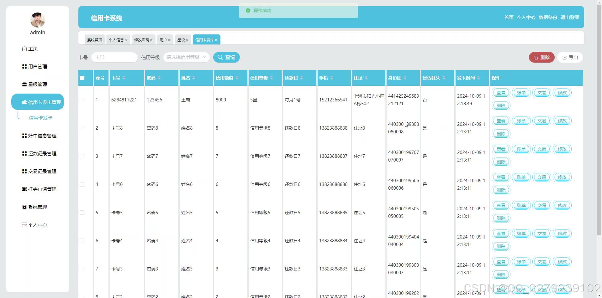 本文介绍了一个基于SpringBoot+Vue的信用卡管理系统设计与实现。系统采用SpringBoot构建后端服务,集成SpringSecurity保障安全,使用MySQL存储数据,MyBatisPlus优化数据交互,前端采用Vue框架。核心功能包括用户管理、信用卡生命周期管理、交易风控和账单结算等,通过加密算法保护敏感信息,并实现自动化账单生成。文章详细展示了系统架构、技术栈、功能模块实现代码及