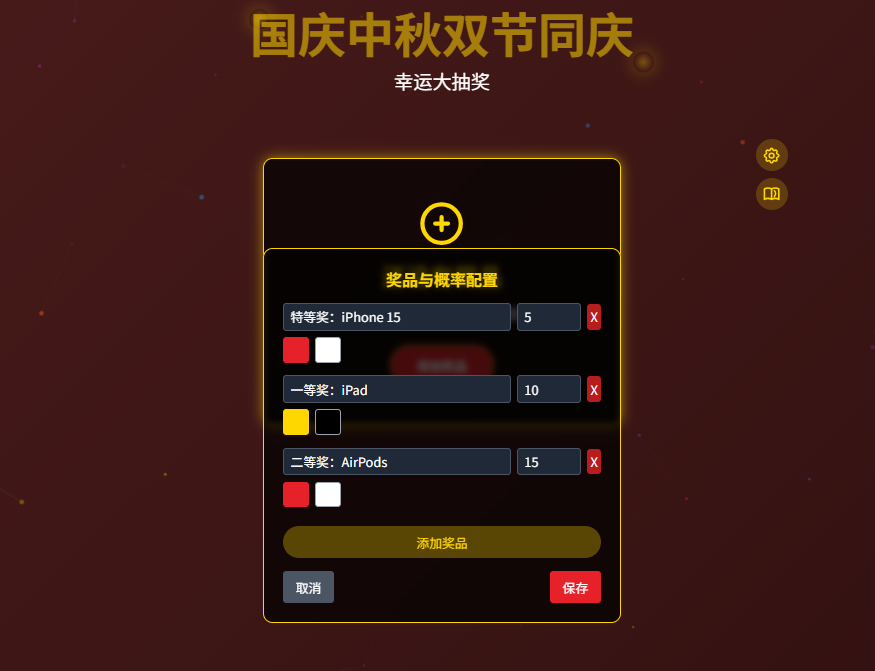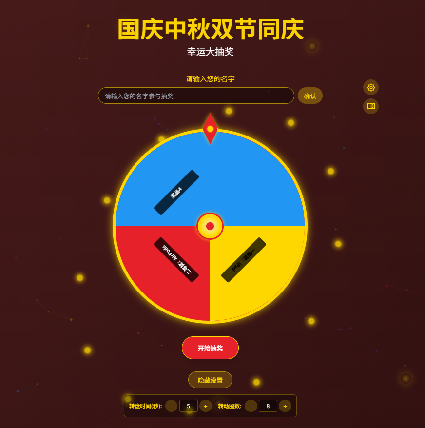 在功能上一开始我们通过自己设置好奖品,能够通过姓名输入后开始抽奖,中奖后还有排行榜根据奖品排行。还有轮盘的一些设置中奖特效以及音效等