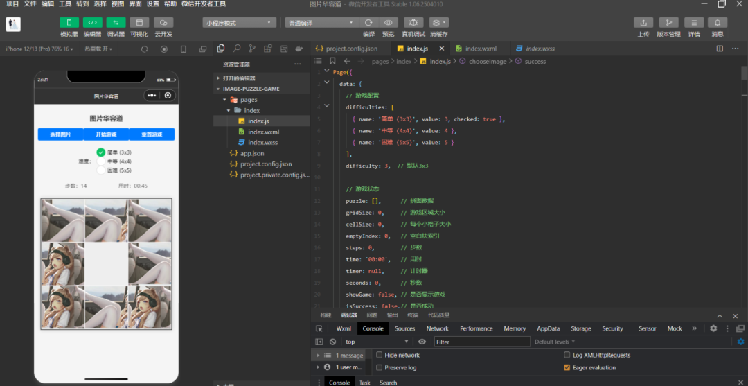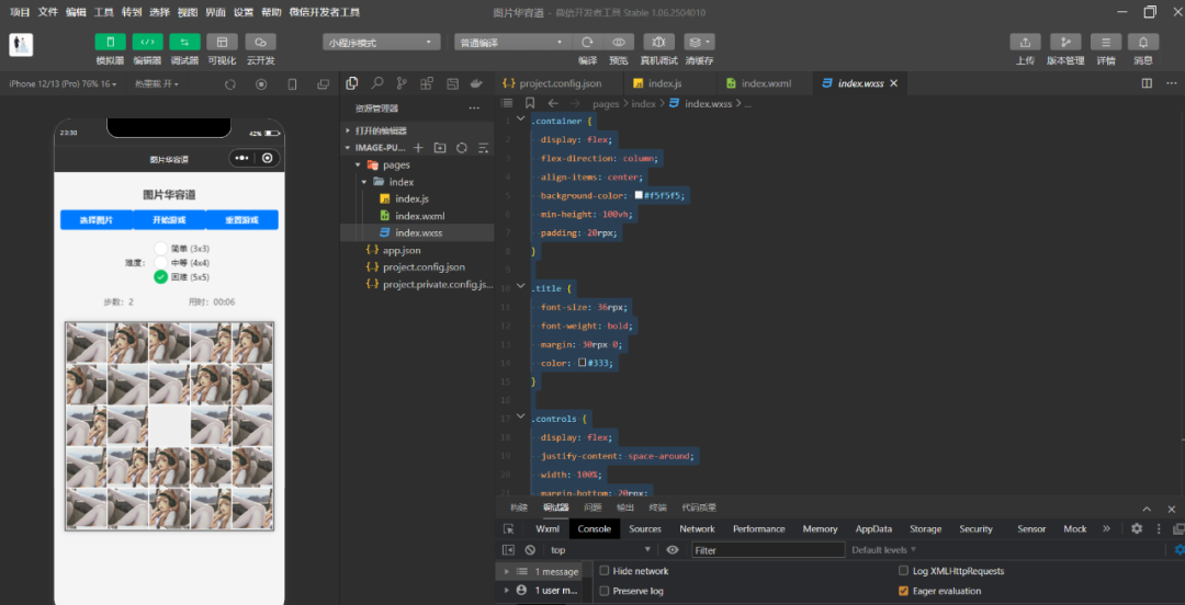 把 AI 给的所有代码(JS 逻辑、WXML 结构、WXSS 样式这些文件)一股脑放进微信开发者工具,然后点击 “编译”—— 天呐!左侧模拟器里直接弹出 “图片华容道” 的界面!