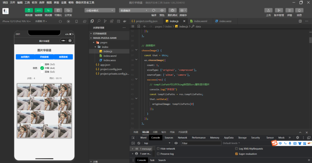 wx.chooseImage接口,能从相册选图),到 “根据难度切割图片成拼图块”,再到 “计算步数、计时、判断游戏是否通关” 这些逻辑,AI 每一块代码都标了注释,比如 “这里是打乱拼图的算法,避免出现无解情况”“这里处理空白块的移动逻辑”…… 我跟着复制粘贴,几乎没怎么改。