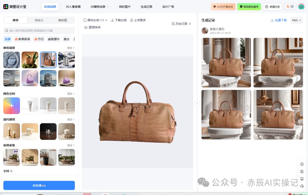 美图设计室的商品图功能,能把这些复杂步骤压缩到几分钟,上传产品照,AI自动抠图,再选择合适场景,就能生成高质感的效果图。