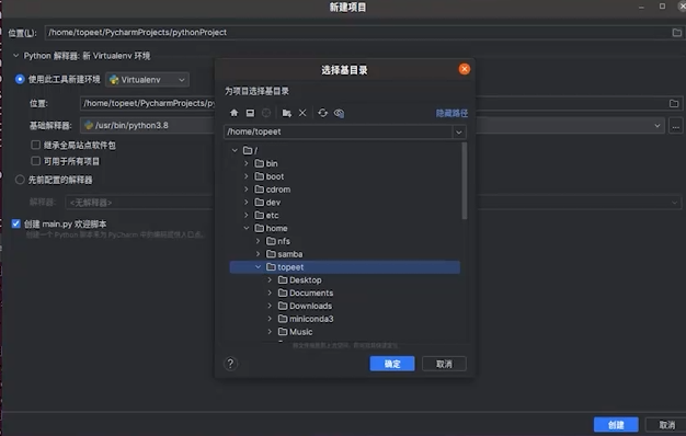 选择先前配置的解释器,选系统解释器,/home/topeet/miniconda3/envs/bin/python3