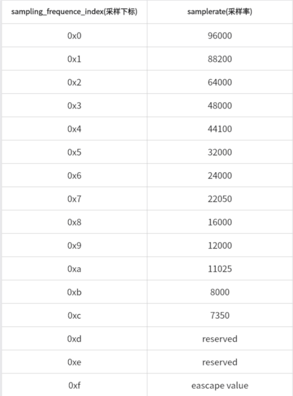 AacFreqIdx AacFreqIdxTbl[13] = {{96000, 0}, {88200, 1}, {64000, 2}, {48000, 3}, {44100, 4}, {32000, 5}, {24000, 6}, {22050, 7}, {16000, 8}, {12000, 9}, {11025, 10}, {8000, 11}, {7350, 12}}; //索引