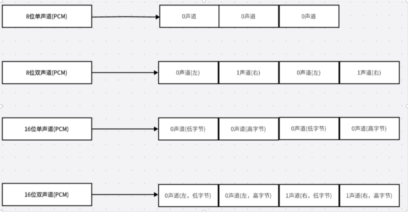 上图是PCM单双声道的存储布局,这里我们来重点讲解一下双声道的布局。一般双声道的存储有两种存储方式,一种是交错模式、另外一种是非交错模式。交错模式:首先记录第一帧的左声道样本和右声道样本;非交错模式:首先先记录一个周期内所有帧的左声道样本、再记录所有右声道样本