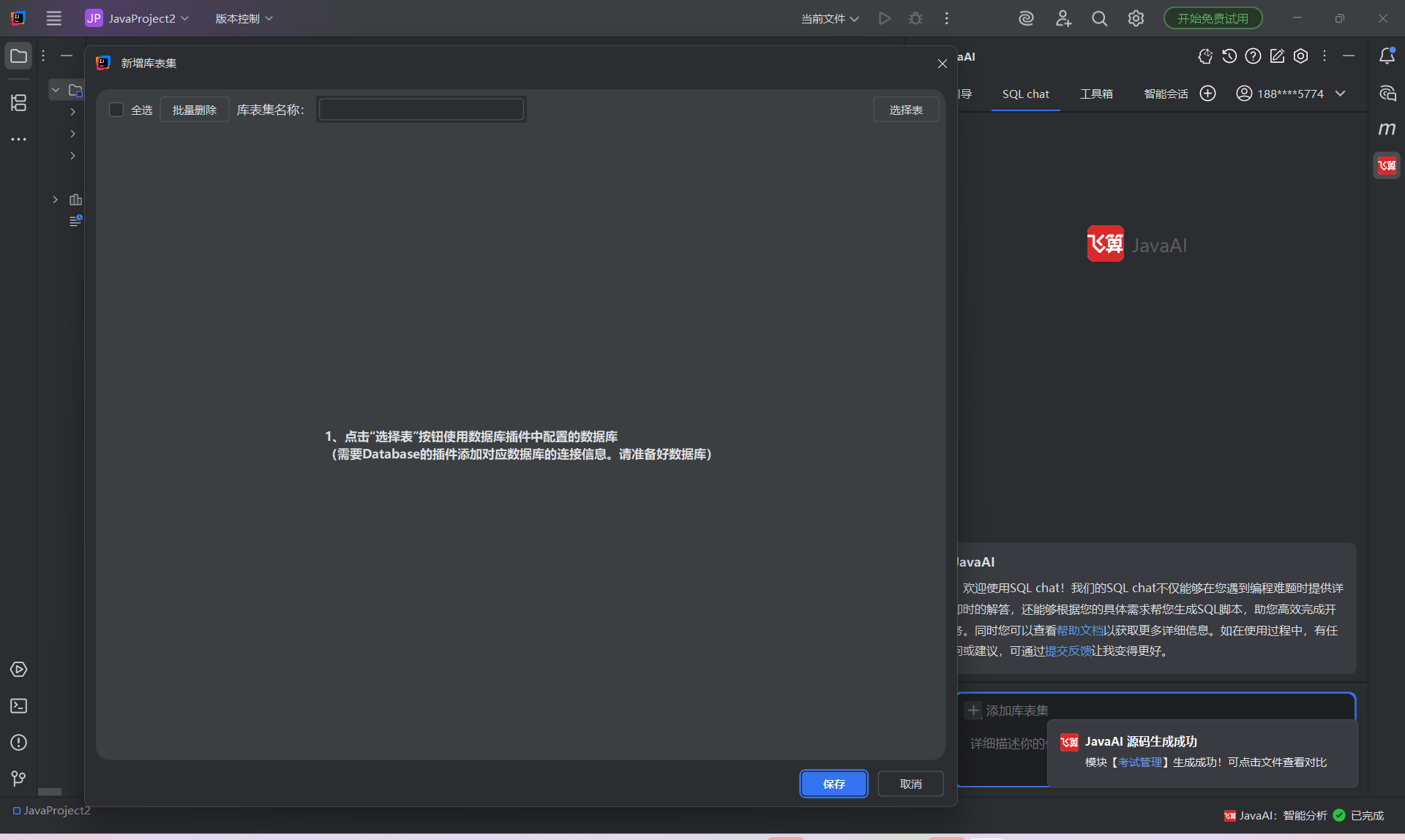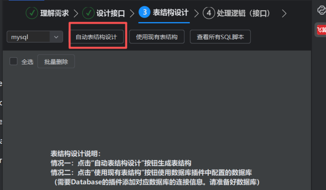 但是在返回代码生成部分,表格设计这一块会有一个自动表格设计,在这里能帮你连接到数据库,后续的JavaAI就能按照这个数据库进行快速创作。