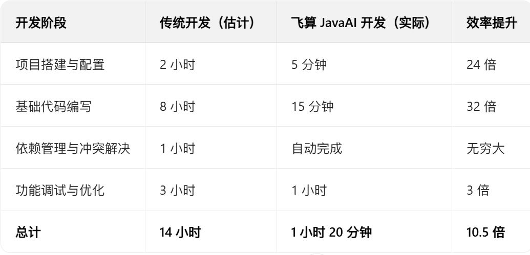 为了量化飞算 JavaAI 带来的效率提升,我对比了使用 AI 工具和传统方式开发相同功能模块的时间消耗: