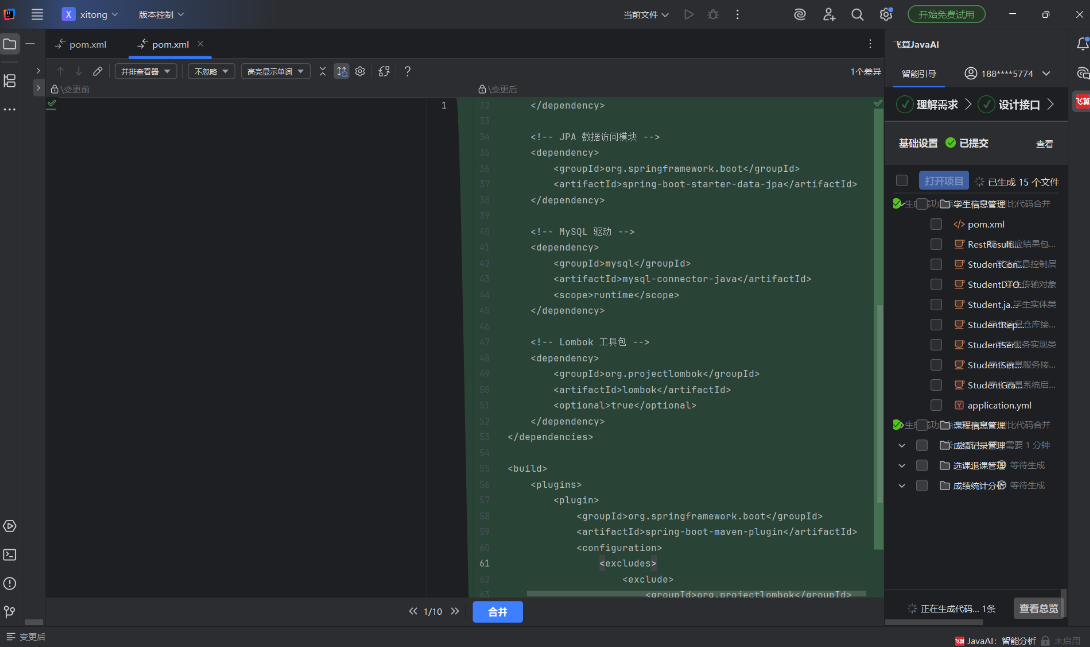 迭代开发支持:在我提出 "增加成绩导出为 Excel 功能" 的新需求时,飞算 JavaAI 能基于已有代码进行增量开发,而不是重新生成整个项目,这一点远超许多只能进行一次性代码生成的工具。