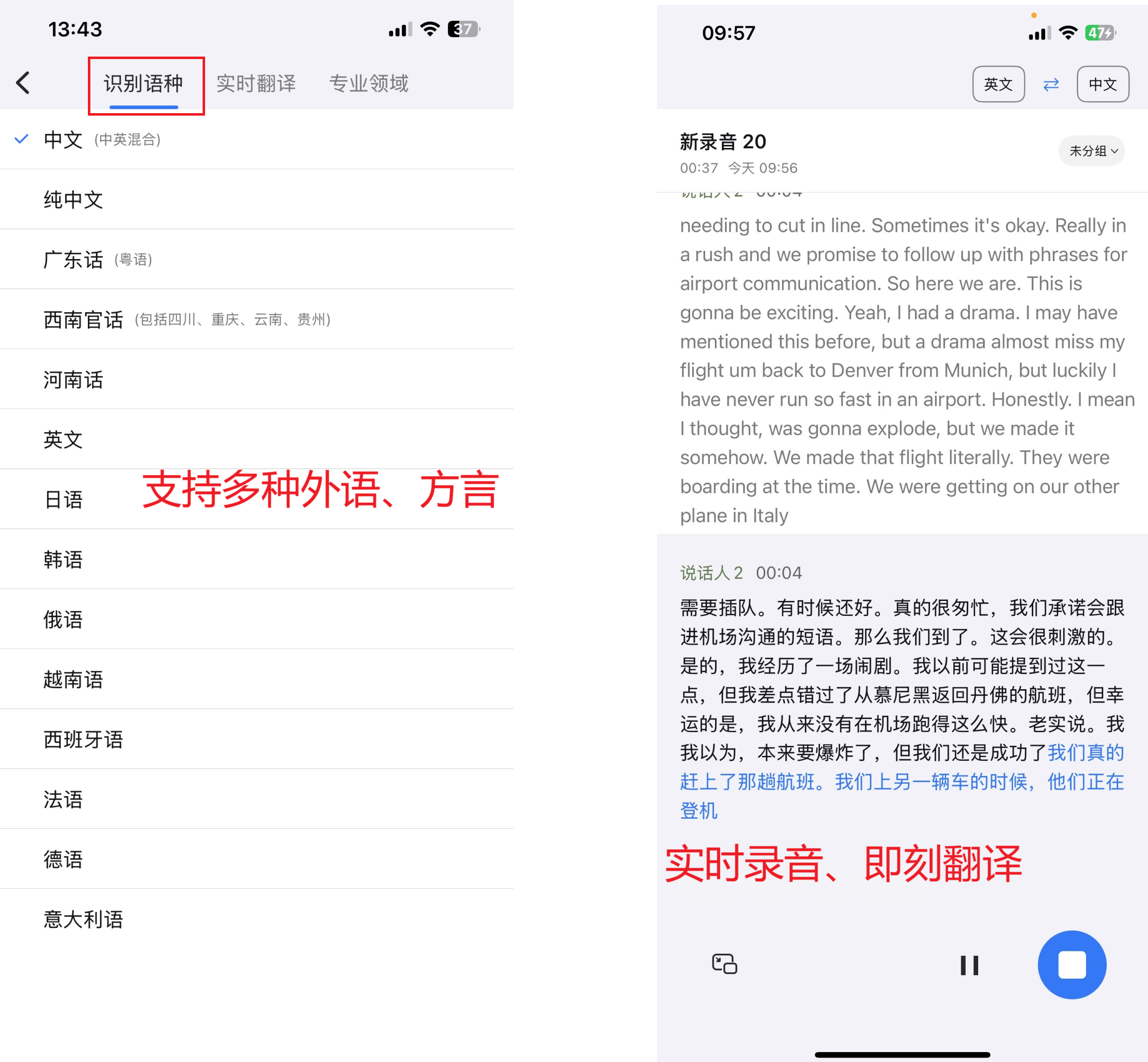 高精准度与广泛语言支持:随身鹿的转写准确率高达99%,不仅支持中英混合识别,还覆盖了粤语、西南官话等多种方言及日语、韩语、法语等多种外语。它还提供针对教育、金融、医疗等13个专业领域的优化选项,确保了专业术语的识别精准度。