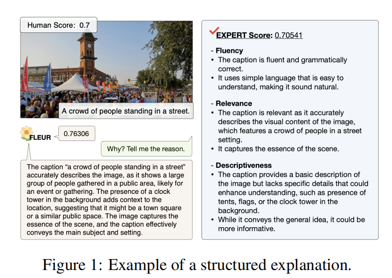 2)设计了一个两阶段评估模板,以有效监督通用VLM,并结合人类偏好和高质量的结构化解释。第一阶段为评分阶段,查询模型并分配分数;第二阶段为解释阶段,查询模型并提供基于流畅性、相关性和描述性的简要解释。