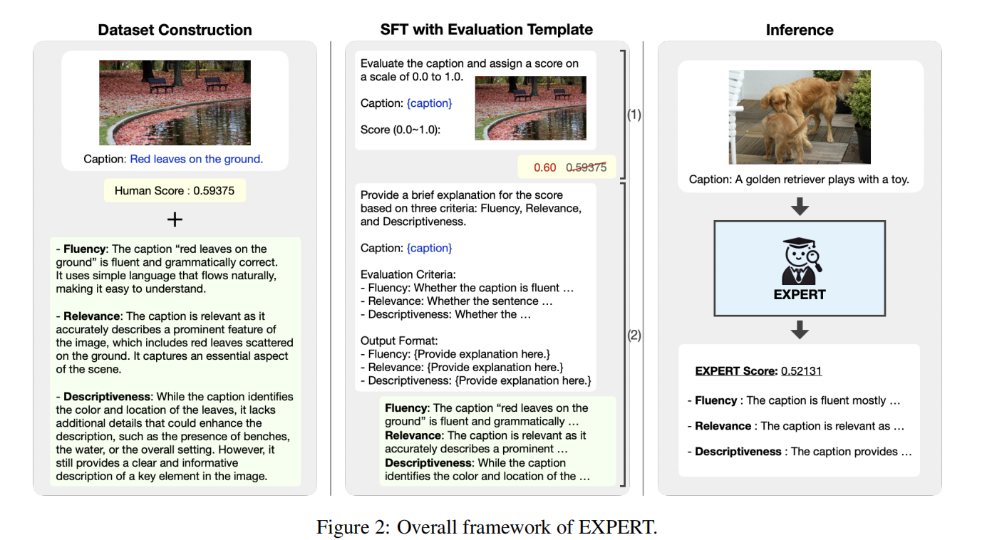 本文提出EXPERT,一种基于视觉语言模型的无参考图像字幕评估指标。通过构建包含42,000+结构化解释的数据集(Polaris-exp和Nebula-exp),从流畅性、相关性和描述性三个维度规范解释生成。设计两阶段评估模板:先评分后解释,并采用LLaVA-1.5模型进行监督训练。方法解决了现有指标解释不一致和质量未验证的问题,通过人工评估验证了解释质量,最终实现兼具数字评分和结构化文本解释的可