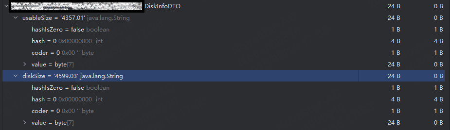 由于JVM的字符串池(String Interning)机制或代码逻辑,这两个DTO的diskSize字段可能指向内存中的同一个String对象。