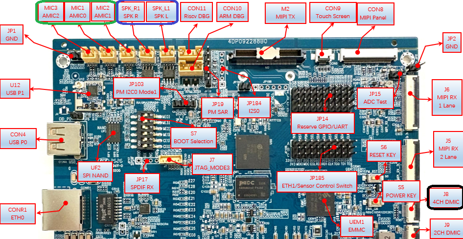 3.1、AMIC连接MIC0,MIC1,MIC2(如图中绿色框所示),扬声器连接SPK_L和SPK_L(如图中蓝色框所示);