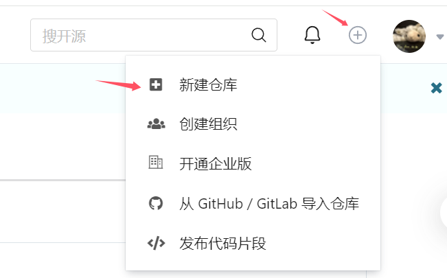 登录gitee账号后,点击右上角的小加号新建仓库: