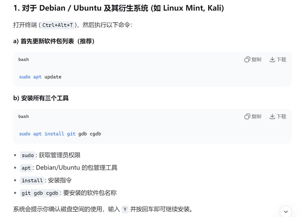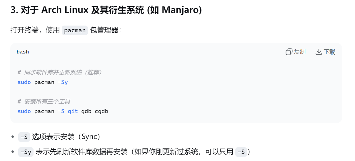 目录1. 下载git/gdb/cgdb2. 认识git/gdb/cgdb2.1 git2.1.1 创建项目2.1.2 git三板斧2.2 gdb2.3 cgdb3. gdb/cgdb的基本操作3.1 操作总结这个命令大家可以直接AI,下面是我用Deepseek生成的,大家直接根据自己的系统下载就行,有问题也可以问AI。git 是一个开源的分布式版本控制系统(Distributed Version