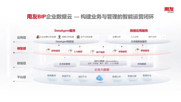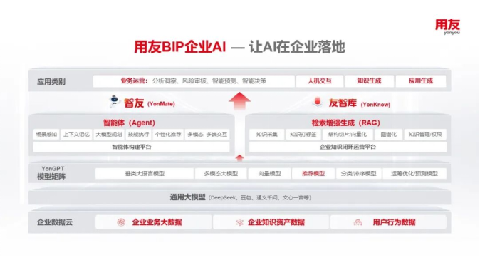 数据之上,便是模型。许多企业都关心,用友究竟是如何构建企业专属模型的?为此,他们打造了一个YonGPT模型矩阵,将多种类型的大模型与小模型组合在一起,实现从通用智能到行业与企业特需的深度适配。除YonGPT外,用友还针对特定行业或业务域训练了垂类大模型;训练了可处理视频、PDF等非结构化内容的多模态大模型,帮助企业读懂自身知识资产;训练了向量模型,提升信息匹配精度;训练了推荐模型,基于用户行为偏好精准推送最有价值内容;训练了分类/排序模型,智能识别高频、高价值数据,优先呈现关键信息;训练了运筹优化与预测模型,应用于销量预测、资源调度等场景,帮助企业前瞻性决策。事实上,模型层是用友BIP企业AI整体架构中的核心中枢之一。全新的用友BIP企业AI经过优化,整个架构以数据为基础、以模型为引擎、以智能体为执行与交互载体,形成从底层数据支撑,到中间的模型能力构建,再到上层智能应用与运营的完整闭环。