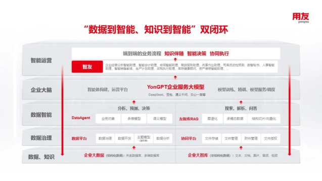 在数据到智能的闭环中,企业大数据是基础,它主要以结构化数据为主,涵盖关系数据库、多维数据库。这些数据在通过数据平台治理后,就为智能提供了“养料”。换句话说,通过将准备好的数据与业务对象、多维模型和语义理解深度融合,就可以实现分析、预测、决策等功能,更重要的是,可为YonGPT训练、精调提供保障。另一方面,企业大智库则构成了从知识到智能的闭环。过去,ERP主要处理结构化数据,而在模型时代,用友通过协同平台,并利用友智库RAG,将知识图谱化、向量化或切片,最终转化为可检索、可推理的知识资产,然后再用这些资产训练YonGPT。当理解了数据与智能的关系后,一个灵魂问题就出现了:谁来支撑这套体系运转?用友交出的结果是:企业数据云。整体来看,作为底层支撑,企业数据云汇聚了企业业务大数据、企业知识资产数据以及用户行为数据,为上层模型和应用提供丰富且关键的数据源。