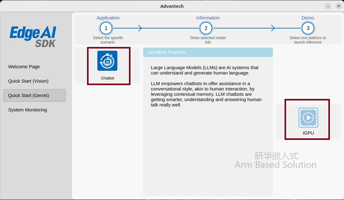 选择快速启动 (GenAI): 选择聊天机器人和 iGPU