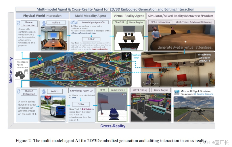 我们在图2中展示了一种用于多模态和跨现实(cross reality-agnostic)集成的增强型交互代理,该代理带有一种涌现机制。一个AI代理需要为每个新任务收集大量的训练数据,这对于许多领域来说成本高昂,甚至是不可能的。在这项研究中,我们开发了一种无限代理(infinite agent),它学习将通用基础模型(例如,GPT-X, DALL-E)的记忆信息迁移到新的领域或场景中,用于在物理或虚拟世界中进行场景理解、生成和交互式编辑。