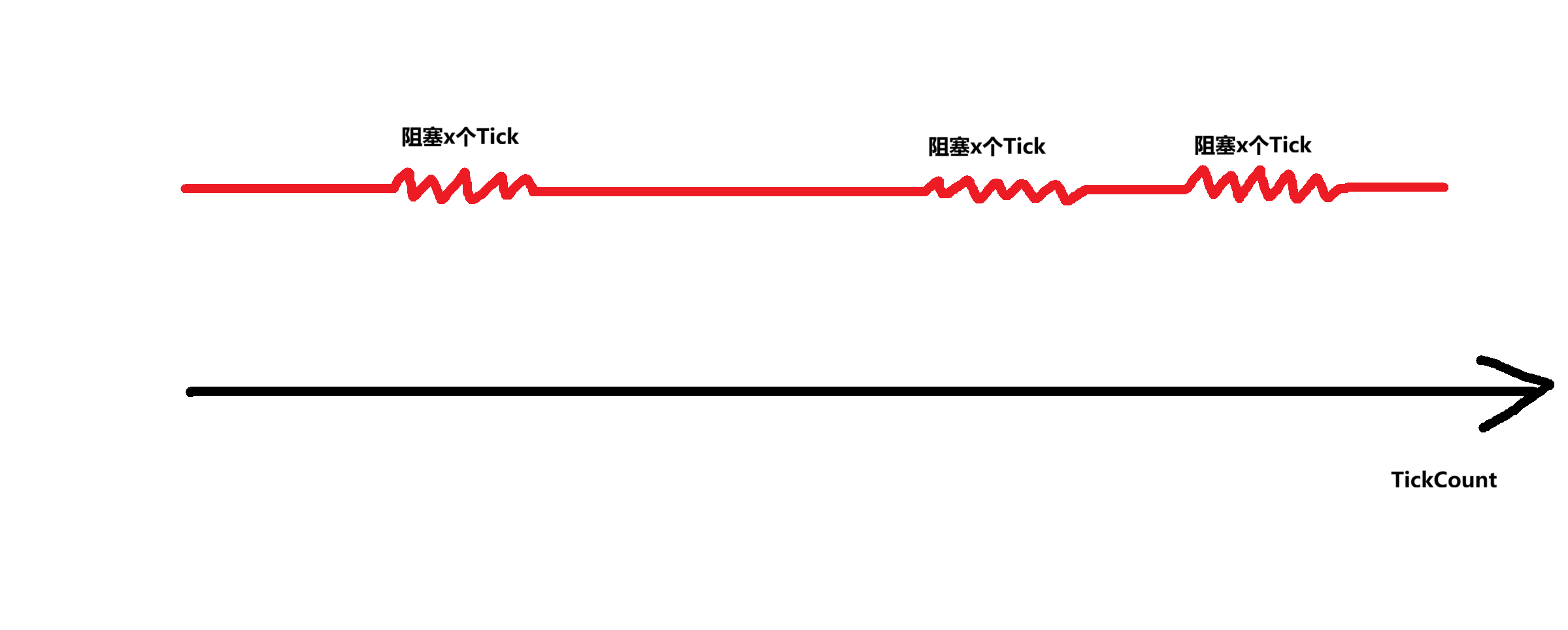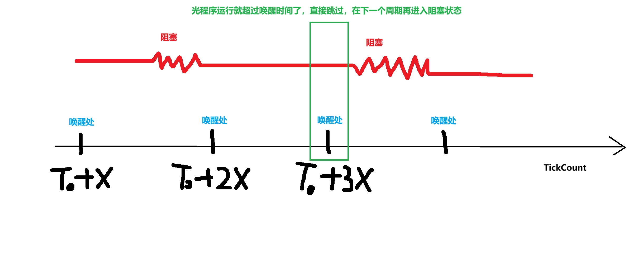 如果单单程序运行时间就超过了x个Tick值,那么这一次的阻塞会直接跳过。比如起始Tick为0,设置第二个参数为10个Tick,如果第一次程序运行用了3个Tick,那么阻塞时间就是7个Tick,如果第二次程序运行用了12个Tick,那么这一次的阻塞时间跳过,用下一个的唤醒时间计算,即会被阻塞8个Tick