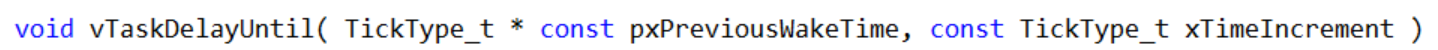 - vTaskDelay():参数为要阻塞的 Tick 时间数,用于实现普通的延时,由于每次程序运行的时间不确定,所以被唤醒时总时间线上的Tick计数值无法确定,不能实现固定周期的唤醒,不过平常使用也足够了