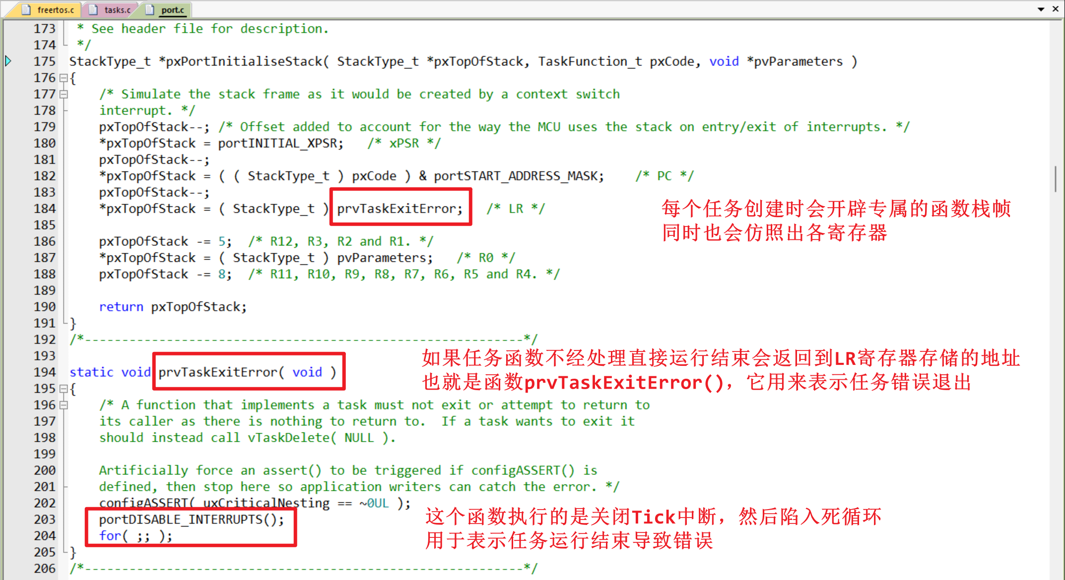 每一个创建的任务必须是死循环,不能存在任务运行结束或任务有返回值导致任务提前退出的情况,否则会导致程序进入prvTaskExitError( void )函数,让程序死机