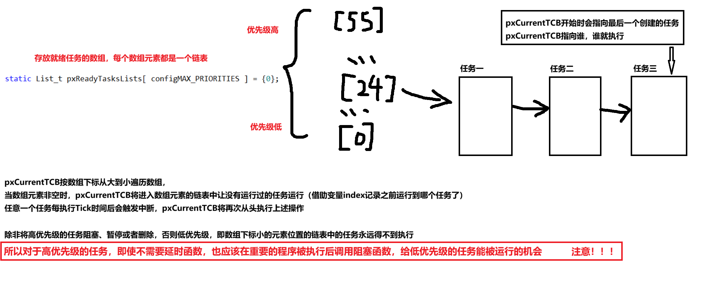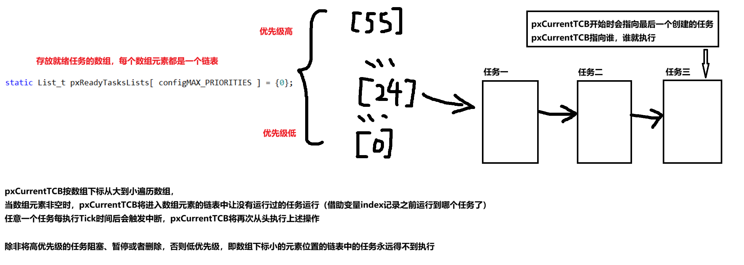 pxCurrentTCB按数组下标从大到小(即任务优先级从高到低)遍历数组,当数组元素非空时将pxCurrentTCB指向此时数组元素的链表中的第一个任务,当第一个任务执行一个Tick时间后再次中断,每个链表中都有一个专门的变量index用于记录此链表已被执行的任务位置以保障每个任务都被执行前不会发生有某一个任务被重复执行的情况,