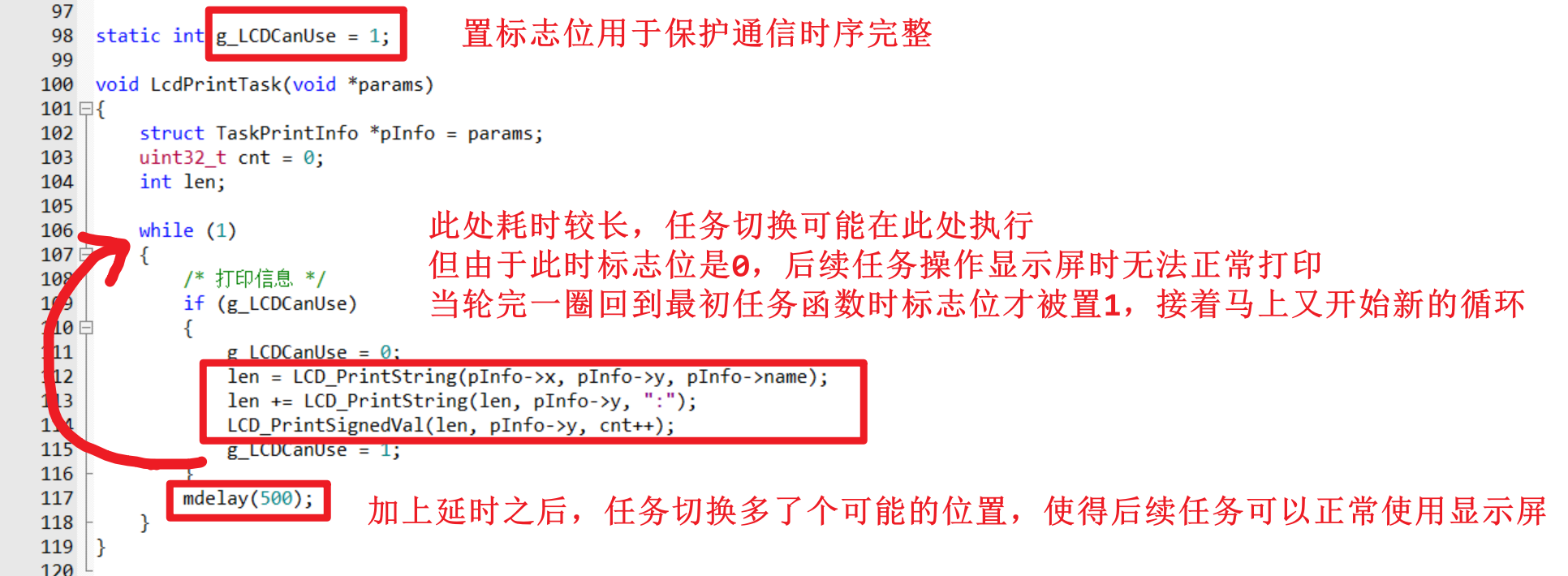 又因为显示屏使用IIC通信,想要在显示屏上都能正常显示,需要通信时序不能被打断,所以需要将通信过程保护起来,每次任务切换前需要判断当前通信是否完成,同时需要加延时