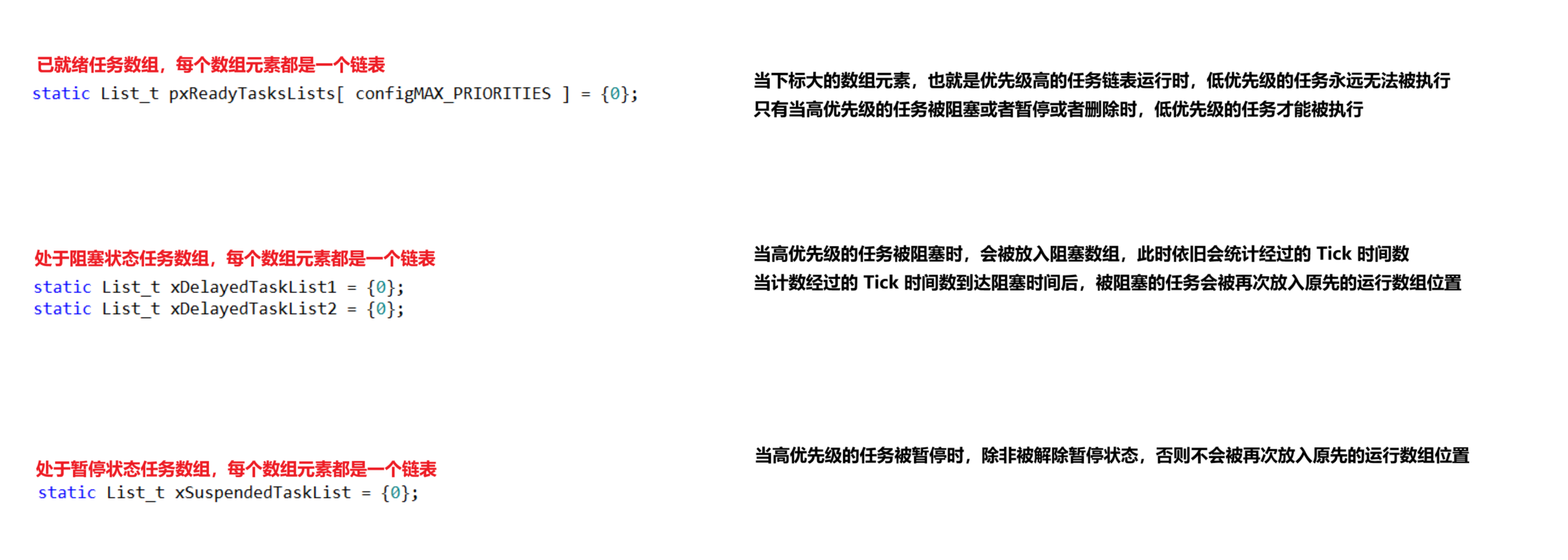 每个数组元素都是一个链表,链式存储该优先级下处于Ready或Running状态的任务