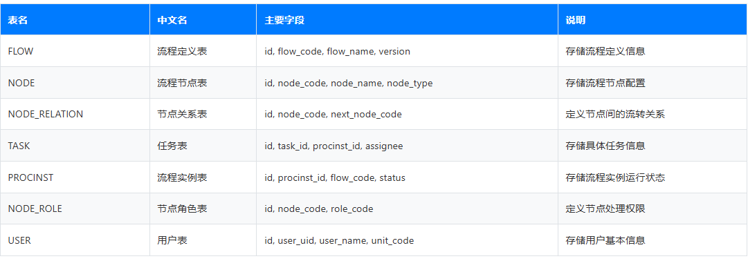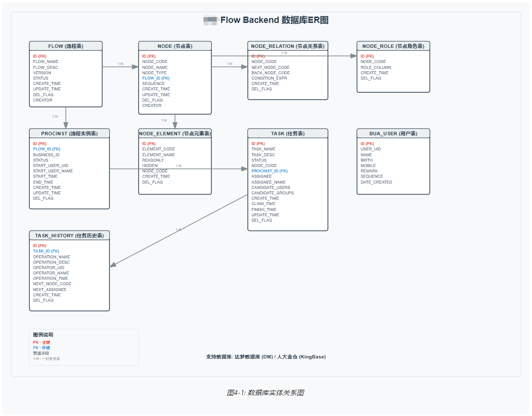- 流程相关表: FLOW, NODE, NODE_RELATION