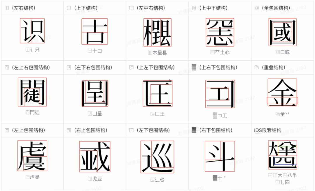 通过分析汉字的空间结构输入相应的IDS表达式生成字体字形,以上是不同空间结构的示例