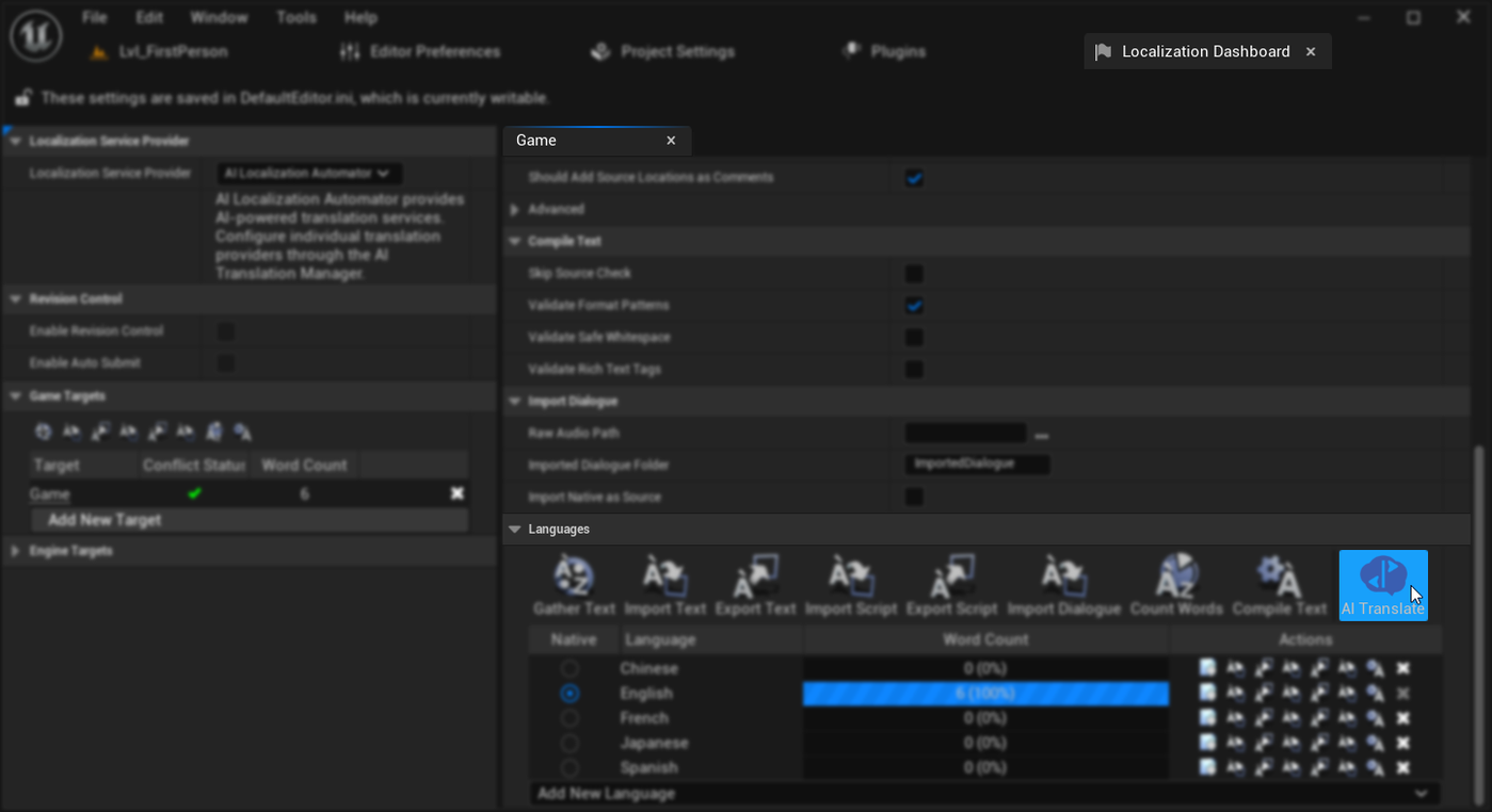 您现在已为游戏实现了自动化AI翻译!该插件负责连接AI提供商并处理翻译流程,同时与虚幻引擎的本地化系统无缝集成。