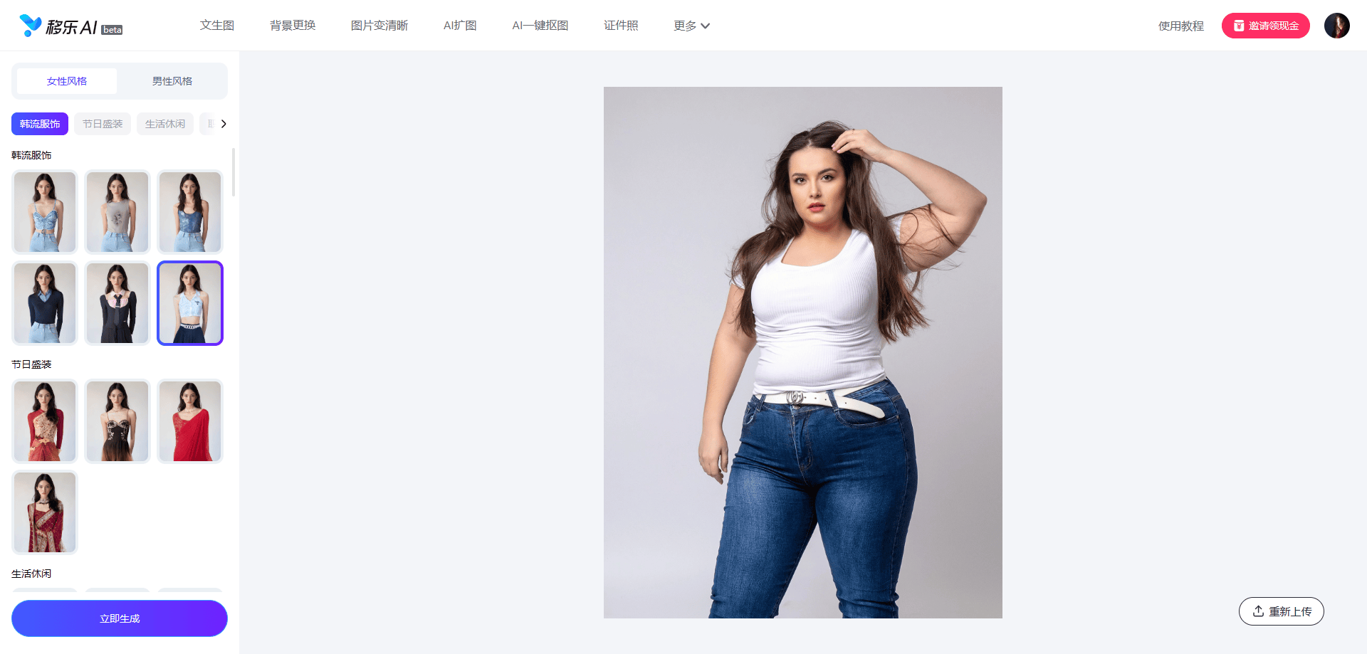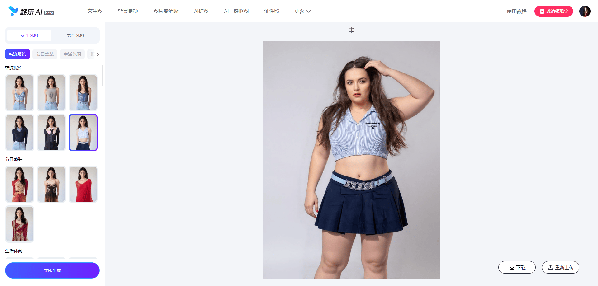 Step3.生成保存:点击“立即生成”按钮,等待约10秒钟,AI即可自动为你完成换装,满意即可下载保存。