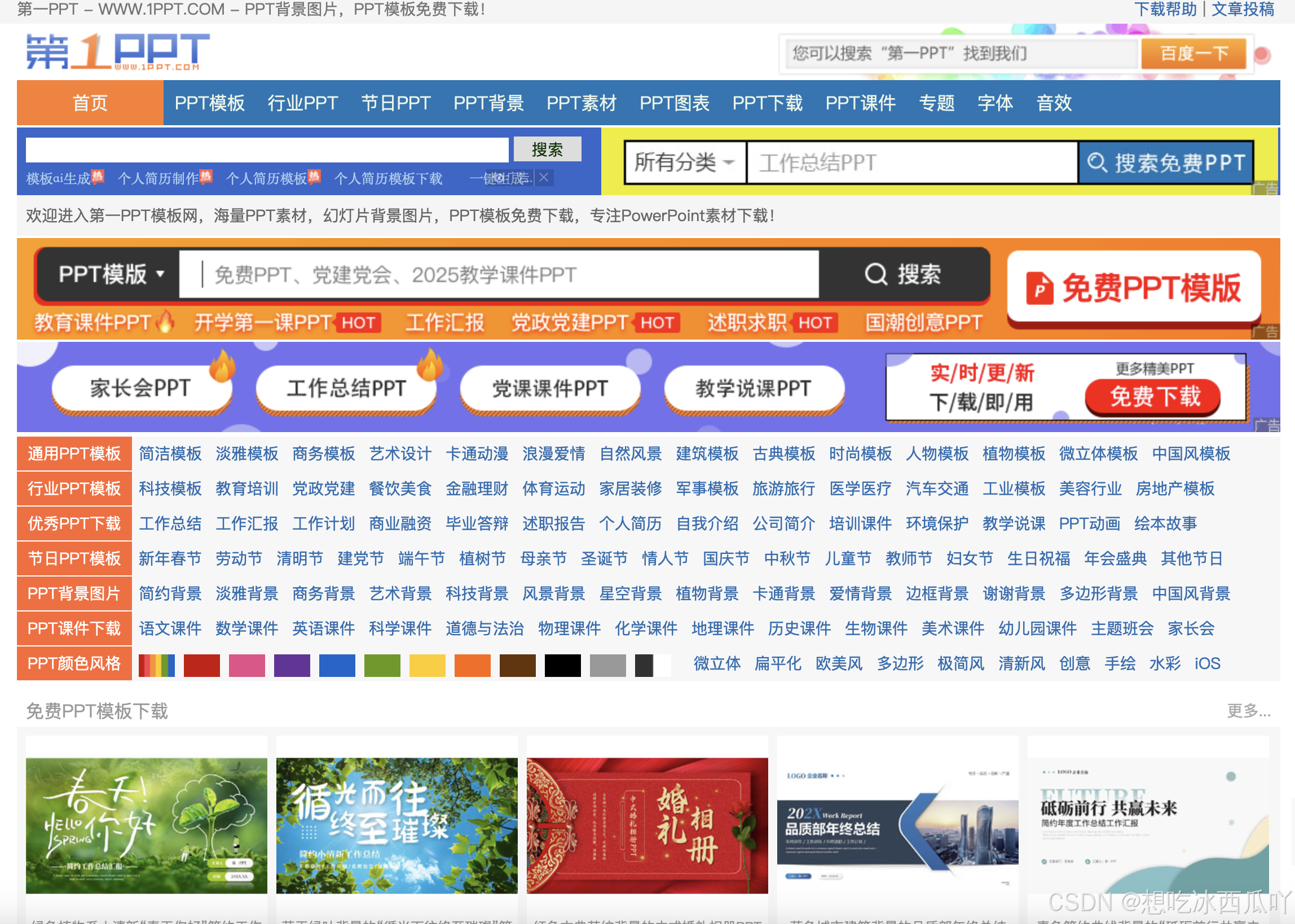- 第一PPT:作为老牌网站,其资源覆盖面极广,不仅包括PPT模板,还提供海量的PPT背景、素材、图表、课件甚至软件和教程。其分类非常细致,从通用模板、行业模板到节日模板、颜色风格,有近百种分类。然而,由于其历史悠久,部分模板设计可能未能及时更新,显得有些过时或“老旧”,用户需要花费更多时间筛选。