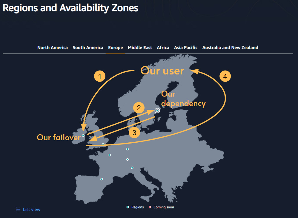 It would be ideal if our dependency were also available in Ireland, but we didn’t have control over the failover mechanism of that system, neither was the cost justified for the team responsible for our dependency. Our dependency was a stateful service and having a multi-region strategy would imply database replication. Our service didn’t justify the cost of resources and complexity.