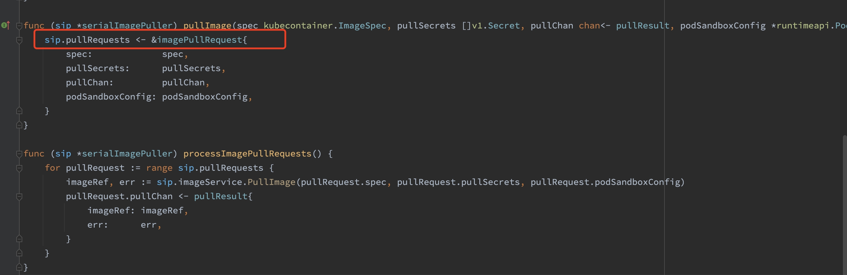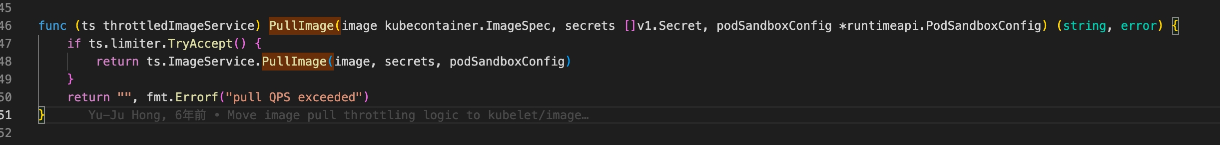 pull QPS exceed**代码,判断kubelet默认串行拉取镜像的(现在的默认策略),串行也会走到 pull QPS exceeded 这个报错,也就是只有可能有其它镜像拉取的时候卡住了,才导致这么慢的。