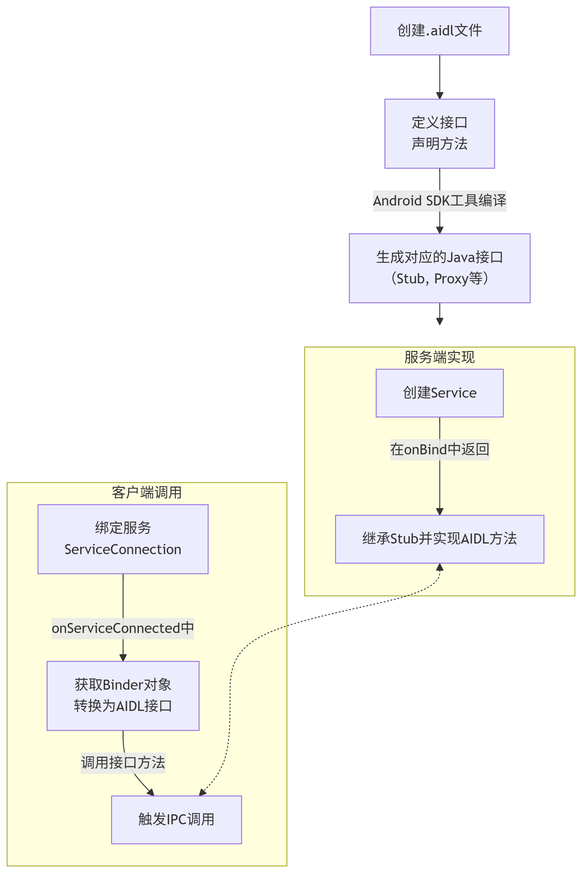 其工作流程可以简化为下图,它清晰地展示了从 AIDL 文件定义到最终完成 IPC 调用的全过程: